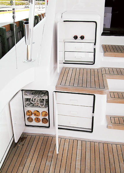 As with the port-side guest stateroom and the forepeak VIP stateroom, the master offers an en suite head and plenty of stowage in drawers and cabinets. In addition, both the VIP’s queen-size berth and master’s king have large stowage compartments beneath the mattresses, accessed via hatches that lift easily on gas-assisted rams. All these quarters are more than just comfortable; they’re downright cushy and well-appointed.