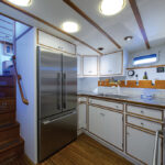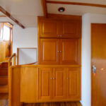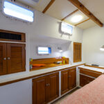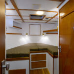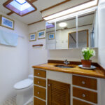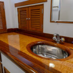 The owner’s head is opposite to starboard and has a stall shower outboard, teak with inlaid birdseye maple basin and a countertop with generous custom storage with teak drawers.