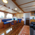 The interior finish is Herreshoff-style, with white painted panels throughout, trimmed everywhere in teak.
