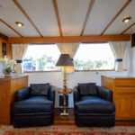 A pair of easy chairs upholstered in leather flank a locker to port.