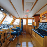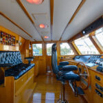 A single Stidd helm chair in black leather fronts the helm console, which is entirely constructed in teak, and is furnished with a teak-rimmed, stainless steel destroyer-style wheel.