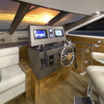 A smart-looking helm with superb visibility includes a fiberglass dash with all the accommodations: electronic engine controls, gauges and communication and navigation electronics.
