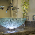 Nearby, the day head is big, naturally lit with a tinted window and accented with a stone countertop, backsplash, and sink.