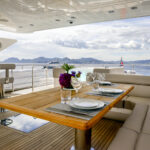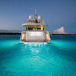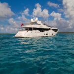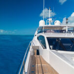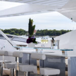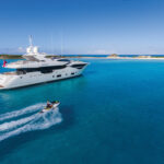 Back aboard Lost Boys, a hot shower on the swim platform rinsed away the morning’s salt and we retired to the after deck for an amazing lunch prepared by chef Sergio Marichales. Culinary attractions and outstanding presentations are a major draw aboard luxury charter yachts and we weren’t disappointed. It was hard to leave the table for the afternoon of swimming and water sports, but the personal watercraft, the SeaBobs and the slide beckoned. Grabbing ahold of one of the PWCs, I circled the yacht a number of times, and its characteristics became more and more apparent.