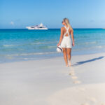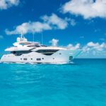 Flying into the Exumas, I was to meet Lost Boys anchored just off Staniel Cay. Surveying the waters below from on high, I spotted her in the anchorage; her snow white angular hull and superstructure stood out amongst a collection of traditionally designed yachts, some larger, some smaller. Sunseeker’s styling is eye-catching to be sure—accented with design lines, sculpted fiberglass and window glazing and gleaming stainless. She may have been on the hook, sharing the sandy bottom with the others, but she was only a hitch away from getting the party started.