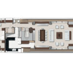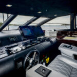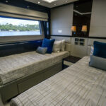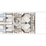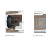 A staircase amidships leads to a lobby and access to the other four staterooms. Two staterooms are fitted with double berths, while two have a pair of single berths that can convert to doubles to maximize flexibility for family and guests. Separate crew’s quarters include a lobby, a mess and dining area, and three staterooms, each with a head and shower.