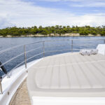 While the interior of the 116 is noteworthy for its formal fit and finish and accommodations, the exterior raises the bar on entertainment and fun. Wide teak-planked side decks lead toward the bow, which offers a second outside main deck dining area and aft-acing, L-shaped lounge seating. Double-width sun pads easily convert into forward-facing lounges. Still forward and down a couple steps is another pair of intimate seating areas port and starboard. If desired, some of this seating can be eliminated to make room for a hot tub.
