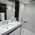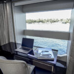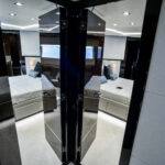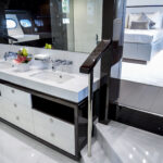 Sliding stainless-steel framed glass doors from the after deck lead into the salon. Accommodations are decided by the owner for their specifications but generally feature social areas including lounges, armchairs, a coffee table, stowage consoles, a 55-inch television screen that rises from the cabinetry and a comprehensive entertainment package. The wenge wood joinery aboard Lost Boys was deeply grained and its satin finish was flawless. A special touch was an owner-specified option for skylights in the ceiling; it dramatically enhanced natural lighting during the day. More obvious though was the volume of light and visibility afforded by the full-height side windows of the salon and the angular bulwarks outside the windows that allowed unobstructed views to the horizon while seated in climate-controlled comfort. Forward of the salon there is a formal dining area that seats ten. Flanking consoles house china and dinnerware. The well-equipped galley is nearby but a door isolates activity from filtering into the inner social areas.