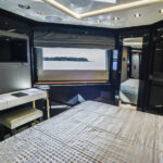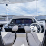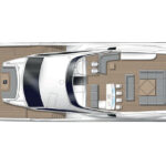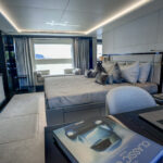 Every inch of its LOA is beautifully proportioned for practical use. Visually, the window lines add definition and complement the abundance of fiberglass, and the deck plans are exquisite not only in execution but also to maximize space, comfort, convenience and privacy. The five-stateroom layout includes a full-beam master suite on the main deck framed with natural lighting via full-height windows to further exploit the already visual spaciousness.