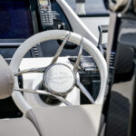 Or, the hot tub can go on the flybridge where the socializing theme ramps up unabated. The flybridge is accessible from the main wheelhouse as well as from the noticeably wide aft cockpit stairs planked with teak. Sunseeker is thorough with its hardware, and the stainless-steel railing to the flybridge is no exception; it curves with the molded shape of the staircase for secure maneuverability. Multiple seating areas include lounges, a dining table and a wet bar with five bar stools, refrigerator, icemaker, a sink and an electric griddle for pancakes on the hook.