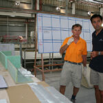 Mark Richards, the CEO and president of the new Grand Banks operation, discusses progress on the new GB 60 with one of his foremen. Many employees these days are Malaysian, but some are Aussies like Richards.