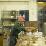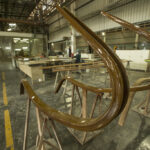 So your initial take is there’s too much clutter cluttering this woodshop? Consider the fact that there is virtually no sawdust evident on the shop floor. Employees at Grand Banks these days are trained to remove by-products, scrap, and refuse from work areas as quickly as possible, sawdust included.