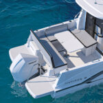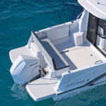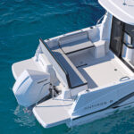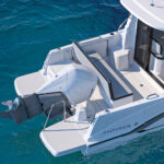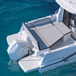 The wheelhouse offers 6 feet, 7 inches of headroom at the helm, a swiveling captain’s chair and a co-pilot seat that has an adjustable backrest so the person sitting there can face forward or aft. The helm has room for a 12-inch Garmin display. Beneteau offers air-conditioning powered by lithium-ion batteries for the cabin space, which will make overnights way more comfortable in southern climes. If you don’t go for the AC, sliding side windows will help get the air moving.