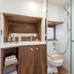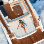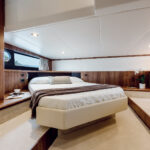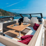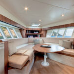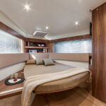Sunpads are laid out almost as mirror images of each other, one in the aft part of the cockpit, and one on the bow deck. A U-shaped settee with dining table amidships should be the focal point for guests less concerned with their tans and more focused on refreshments.