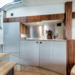 Down below you’ll find an incredibly well-lit saloon with a dining settee that can be converted into a V-berth—helpful if all that fun in the sun gets to your head, as it has a habit of doing. A full galley aft makes preparation of hors d’oeuvres a piece of (crab) cake.