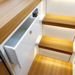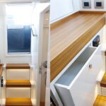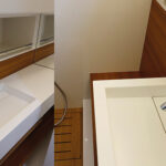 And quality is certainly emphasized. Everything except the glass is done in-house. The company chooses and cuts its own teak, and the stainless steel is completely custom. “It really is a handmade product in terms of all the woodwork and even the polyester,” Ozcan says. “We control the entire process. From the start to delivery we are on top of it.” Because so much attention is put into each boat, clients are able to customize some of the features on board. On the 45, owners can choose their preferred layout, veneer, and upholstery. The locker under the stern sunpad can store two Seabobs and a launching crane or a built-in fish box. Some clients are looking for chase boats for their larger yachts, some clients want one big lounge instead of a cabin, and some clients just want to be able to store and launch toys.