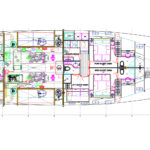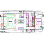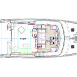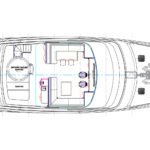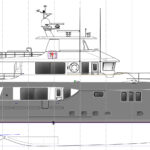 Although the 80 will have conventional power (two 375-horsepower John Deere inboard diesels), there’ll be some standout propulsion-related features as well. Skegs and grounding shoes, for example, will protectively enclose each propeller. And the sections forward of the props will be fuller and somewhat deeper, thereby offering even more protection. Performance, of course, will favor the long-haul set, with a top speed of about 12 knots, a cruise speed of about 9 knots, and (thanks to a 5,000-gallon fuel capacity) an ocean-crossing range.