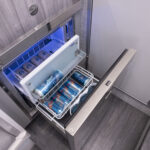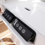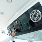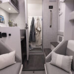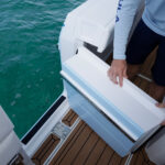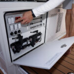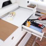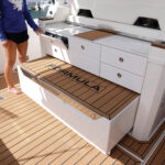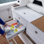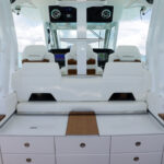 Formula is great at using every inch of the boat in smart, functional ways and the tackle center on the 387 CCF is a perfect example. When you’re out fishing, the aft-facing tackle center has drawers, tray storage and a countertop for rigging with a small sink. Flip the sink lid upside down and you’ll find a cutting board that fits right on top of a bit of decking material the company placed for ascending a ladder up through a hatch in the hard top. When you’re done rigging, a cushion slides over the countertop for some mezzanine seating. There are even AC vents that blow on the small of your back when sitting there. To climb onto the mezzanine, you simply push a button that releases a massive cooler to use as a step or footrest. Formula managed to design this area for three uses: seating, tackle rigging and entertaining.