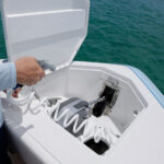 The 387’s cockpit has two lighted, pressurized livewells in the transom, one of which we had filled with live pilchards. There’s also plenty of deck space around the triple 450-hp Mercury Racing outboards, thanks to wings that extend aft on either side of the engines. This extra decking makes boarding much easier and can come in handy if you need to check a prop. There’s lots of seating with a full-beam aft bench that folds away to keep the area unfettered when fishing.