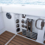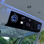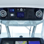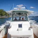 The 387 weighs more than 23,000 pounds loaded, which is heavier than many center consoles of this size. To me, that additional weight is not a bad thing, it helps the twin-stepped hull cut down the chop and land softly. We comfortably cruised at 35 knots with the triple 450-hp Mercury Racing outboards running at roughly 75 percent load. We didn’t even get a drop of spray on the windshield but that’s because we had the windshield up on the run out the inlet. Yes, the windshield opens with the push of a button to give you a nice breeze when idling through no-wake zones, but once we got up to speed, we shut it so we could comfortably have a conversation. The air-conditioning vents on the helm kept us comfortable, minus the breeze.