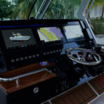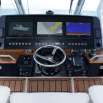 After lunch, it was my turn to take the helm. Sliding into the center helm chair I soaked in all the classy touches on the dash. Formula used a mix of black materials and teak accents to create a yacht-like command center dominated by three 16-inch Garmin touchscreens. The visibility at the center helm chair is unobstructed, even for shorter guys like myself.