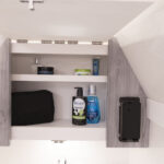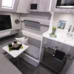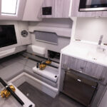 Once at the dock I took a minute to step into the cabin through the portside entry. This cabin is roomier than you’d expect on a center console and with an small skylight and side windows, there’s plenty of natural light coming in, so you don’t feel like you’re in an elevator. A separate wet head has standing room and a shower. But what I loved most about this space was the hidden drawer Formula created to stow the V berth’s filler cushions. These cushions always get tossed around when not in use and Formula managed to solve the issue by creating a drawer that locks in place by two fold-down storage areas. You’d never know the drawer was there.
