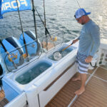 We deployed three live baits on light spinning rods from the bow while waiting for a deep bite (which did not take long). The boat stayed on our mark with little effort thanks to the north wind pushing against the current. And with the Seakeeper 3 gyro doing its thing belowdeck, the boat didn’t roll much more than it would at the dock. We made four successful drops and put a dozen or so roseys in the insulated fish box.