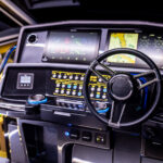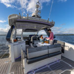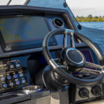 The bucket-style helm chairs seem to hug you in all the right places. They’re downright comfy, and the sightlines through the large windshield and open side panels are completely unabated. Climate control vents blow out of the dash, but two additional vents on the hardtop let the fresh air in as you cruise. Cubbies and phone charging stations live right where you need them. I also like the cleat within arm’s reach of the helm chair so you can get a spring line tied on quickly when shorthanded.