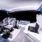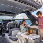 For me, the helm steals the show. The steering wheel doesn’t just tilt—it moves up and down electrically to fit both Mom and Dad, making sure everyone feels confident when piloting the boat no matter how tall they are. And this responsive hull is a blast to drive. It carves a tight turn and has all the oomph you need to slap a smile across your face. It cruises in the low-30-knot range and tops out at 37 knots. Mercury’s joystick piloting makes docking a stress-free endeavor.