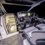 The switch to twin 350-hp Mercury Verados is a big part of the space savings as it moves the power to the transom and opens up more room both in the cabin and on deck, but the larger piece of the puzzle is Galeon’s smart design, layout and use of natural light. From the second you step on board, the cockpit feels roomy yet offers a ton of storage and seating. The extended deck on either side of the outboards lets you board easily and gives access to the outboards for servicing. A fold-down platform over the splashwell and a drop-down port side terrace open up the deck even more.