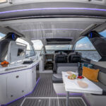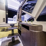 The door into the cabin slides so easily you can open it with just one finger. That might not sound like a big deal, but so many of these doors require half your body weight to open. This one slid like it was on wheels. To make sure you don’t bump your head when stepping down into the cabin, Galeon placed a recess in the hardtop that you can open up. The cabin has windows all around and uses light beechwood to give it a very airy feel. The forward dinette converts to a berth. The wet head uses mirrors and natural light to increase the openness. A double berth aft is comfortable despite the lack of headroom. And to make it easier to crawl into bed, the steps down into the cabin are on hinges so you can lift them out of the way.