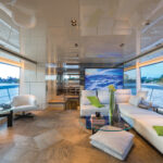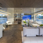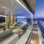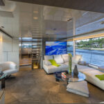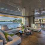 The aft main deck is always a challenge, mostly because you have to question whether the owners will want to lounge or dine in this space. The reality is, most people don’t dine inside as often as they think they will when they buy the boat. They end up taking meals outside. So, I created this space with an alfresco lunch in mind, for a large group who plan to sit out here for hours, eating and watching their guests on the beach club and in the water. It’s part of that lifestyle of being one with the sea. Everything on board was designed around the idea of celebrating life on the water.