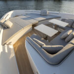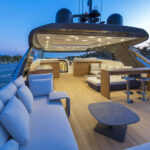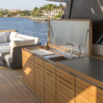 “Deliberately casual” is the term Lowe uses to describe the style of the SX88, and that atmosphere is achieved on the aft deck, with its oversized dining table (above) that overlooks the beach club (below), where there’s 323 square feet of space to keep guests close to the water. It’s very large for a boat in this size range.