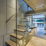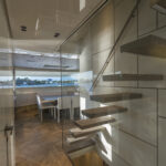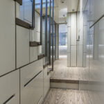 I started with that loft concept, and then the idea of industrial design came to my mind. That’s not something people typically associate with a yacht, but I thought, ‘Why not?’ I think of it as elements in a raw, unfinished and beautiful state. So, there’s this industrial vibe throughout the boat. In the salon, for instance, the flooring pattern is reminiscent of reclaimed wood in a factory, only the sole is covered in oak that’s been stained and sanded down to a worn, warm patina. And at the central staircase, instead of a conventional balustrade, we used vertical tubes with a graphite finish. This tube motif is repeated throughout the boat, in light and bath fixtures, right down to the rods in the hanging lockers. We kept building on the idea because the eye likes cohesion.