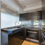 I like the galley. It has an ingenious door that allows you to open the space up to the dining area or close it off completely, as if it were a closet. You just fold up the door and slide it into a pocket frame. We worked hard on that, because, yes, Americans like a more informal space for meals, but after dinner, they may want to close off the galley and give the crew a chance to clean up while they step outside to look at the stars.