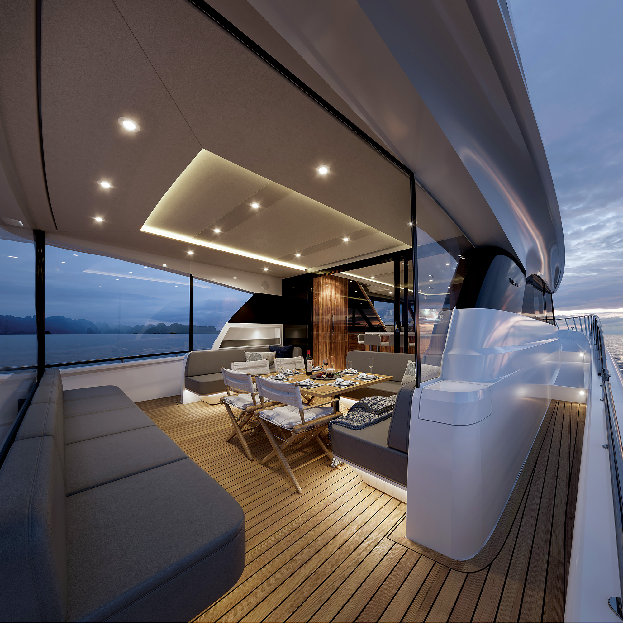 In almost every way, including the driving experience, the M75 feels massive. From its expansive, teak-laden cockpit, which Maritimo calls an Adventure Deck, up to a flybridge that doubles as a second salon to the nonskid-clad bow, everything feels heavy, strong and reassuring.