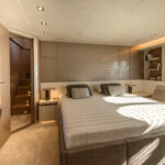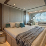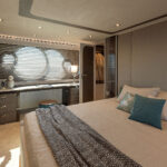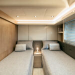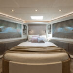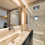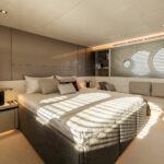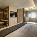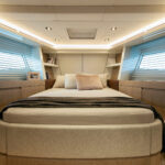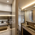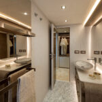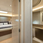 How you do that within the confines of the same basic hull volume is a moot point, but MCY has been nothing if not creative during the course of its short career. For example, the bed in the master stateroom on the original 76 was 6 feet, 10 inches long. That’s impressive—extravagant, even. The designers have acknowledged that buyers so extraordinarily tall as to require a bed of that length must be few and far between, and have reduced it in the new 76 to 6 feet, 4 inches. It still looks huge—and it is indeed 2 inches wider—but reducing the length by a full 6 inches has allowed them to place the bed in the center, fit an expanded head and dressing room across the full beam aft and create a cabin that not only looks better appointed but also feels bigger than its predecessor.