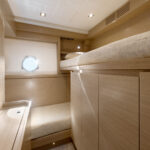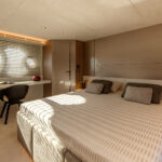 The standard layout down below is also four cabins, but with just the one companionway—for less privacy, perhaps, but more space. There is one slightly quirky aspect of the interior design. In the master suite you walk through the dressing room to get to the head and shower. It looks fine, but I did find myself wondering what the humidity would do to your silk shirts.