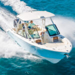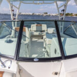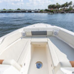 Below the port console are a plumbed head, a sink with a mixer and shower wand, a storage cabinet and foam decking with a drain. Under the starboard console is storage for the bow table and gear. There are a number of power options, including a pair of 150-hp Yamaha F150 outboards or a standard, single 300-hp Yamaha F300. The maximum horsepower rating is 300.