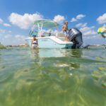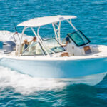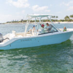 Based on the hull of its 240 CC, the 240 DC is Cobia Boats’ latest dual console model. The multipurpose dayboat, which premiered at the 2019 Miami International Boat Show with a sharp-looking, pale blue hull, falls between the 22- and 28-foot dual consoles in the Fort Pierce, Florida, builder’s lineup. The 240 DC offers a mix of family and fishing features. The boat looks comfortable, and has a utilitarian, hose-down feel.