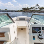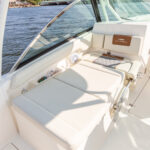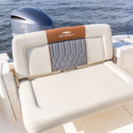 For family cruising, numerous areas transform into comfort zones. For instance, the bow morphs from a casting area to a cushy sunpad. Remove a cushion insert and drop in a pedestal table, and the space is set up for dining. Farther aft, the port console seat has an adjustable seat back that moves forward and aft to form a lounge or twin seats, one facing forward and one aft. In the cockpit is a flip-down transom bench.