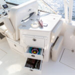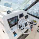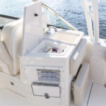 Fish-minded folks will find a transom-mounted livewell, tackle storage drawers, rod storage, plumbed fish lockers, rocket launchers on the hardtop pipework and a cockpit area for prepping and rigging. The helm dash has room for a 12-inch multifunction display.