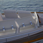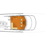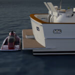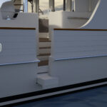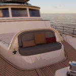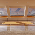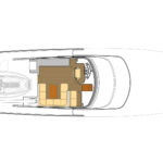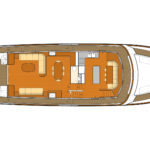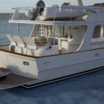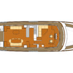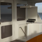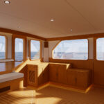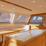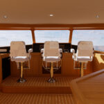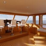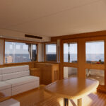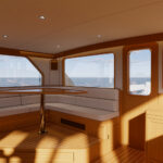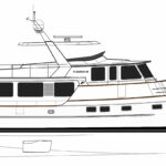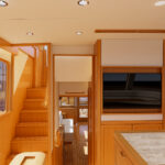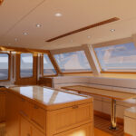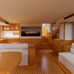 The first thing we can deduce from the initial renderings are that owners will have the option between an enclosed or open flybridge—a nice option to have depending on whether you’re bound for the Bahamas or the Aleutians. The ship-like lines are what we’ve come to expect from the builder: purposeful yet elegant. The hull, we’re told, is created by the naval architects at Norman R Wrights and Sons to be their most efficient bottom to date.