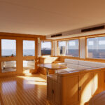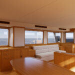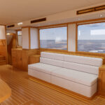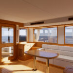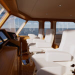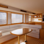 The interior is punctuated by generously sized, double-glazed windows, acres of fine woodwork as well as a three- or four-stateroom configuration (the fourth cabin features twin bunks and eats into the amidships master’s space, but otherwise seems like a fair trade-off.)