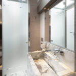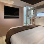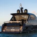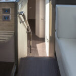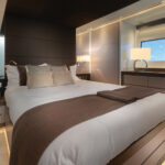 Detailing belowdecks was equally meticulous. Highlights of the three-cabin, two-head layout included a galley down with an A&G side-by-side refrigerator (easily the largest fridge I’ve ever seen on a boat in this size range), lacquered walls, marble floors and Amare custom-made, RINA-compliant infinity-type portholes in the hullside windows (invisible from outside the yacht).