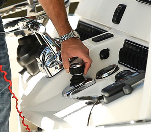 The Mercury joystick system will be offered for the Verado 250 and Verado 300 outboards in dual, triple, or quad configurations. These motors already use digital controls. The joystick package adds an electronic helm (and joystick, of course), a power-steering pump for each motor, plus the latest VesselView information display. VesselView incorporates cruise control, plus an autopilot and the Skyhook application that uses GPS to hold the boat in a selected position, features not offered by Yamaha.