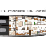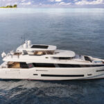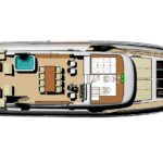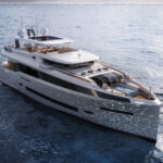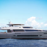 According to Constantinou, the 85 will have exceptional volume for its size (87’7” LOA; 23’3” beam). “More than other boats in its class,” he says. “That’s what we’re going for, yet we won’t sacrifice performance.” Top speed will be close to 26 knots and and cruising range approximately 2,500 miles at 10 knots. Power options are MAN V12s at 1,400 and 1,500 horepower. Engines push a semi-displacement hull by German Frers. Hull stability will be enhanced by two things. “We have a superior beam-to-length ratio and a low center of gravity, in part due to the carbon fiber superstructure,” says Constantinou.