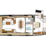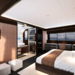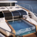 The 85 will have a few features with wow factor, among them private access to the bow from the master suite on the main level. And the bow can be configured as an open entertaining area, or as a space for a jacuzzi or plunge pool. The master also has an opening balcony, which you’ve seen before, only this one has a built-in seating arrangement. We’re also eager to see the combo tender garage/beach club. It seems Sirena went all Transformer on us. After you launch the tender, seating lowers into place to essentially make over the space at the stern.