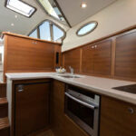 The main saloon is ready to greet guests on an L-shaped settee to port and a bench opposite to starboard. Lowering windows on both sides of the saloon and on the aft bulkhead, in addition to the opening overhead hatches, bring plenty of fresh air inside when cruising.