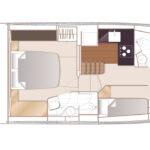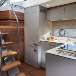 Another step up that the V50 represents for Princess owners is on her accommodations level. This is among the smallest-sized boats the builder offers with an amidships master. Models below her in the range have a forepeak master that doesn’t benefit from the full beam width like that found aboard the V50. The en suite master also has a full head with a shower large enough for American shoulders (or bellies, if you’ve been letting that gym membership slide). There’s also a small settee with a table for morning coffee to starboard and a 5-foot cedar hanging locker that offers decent stowage for a boat of this size and type. A VIP in the forward section benefits from excellent natural light thanks in part to that aforementioned hullside glazing, as well as a hatch overhead. The cabin is also en suite and offers a large stowage compartment beneath the mattress. A very workable galley with an L-shaped counter and three-burner Kenyon cooktop sits between the cabins. It enjoys plenty of natural light from the single-pane windshield overhead.